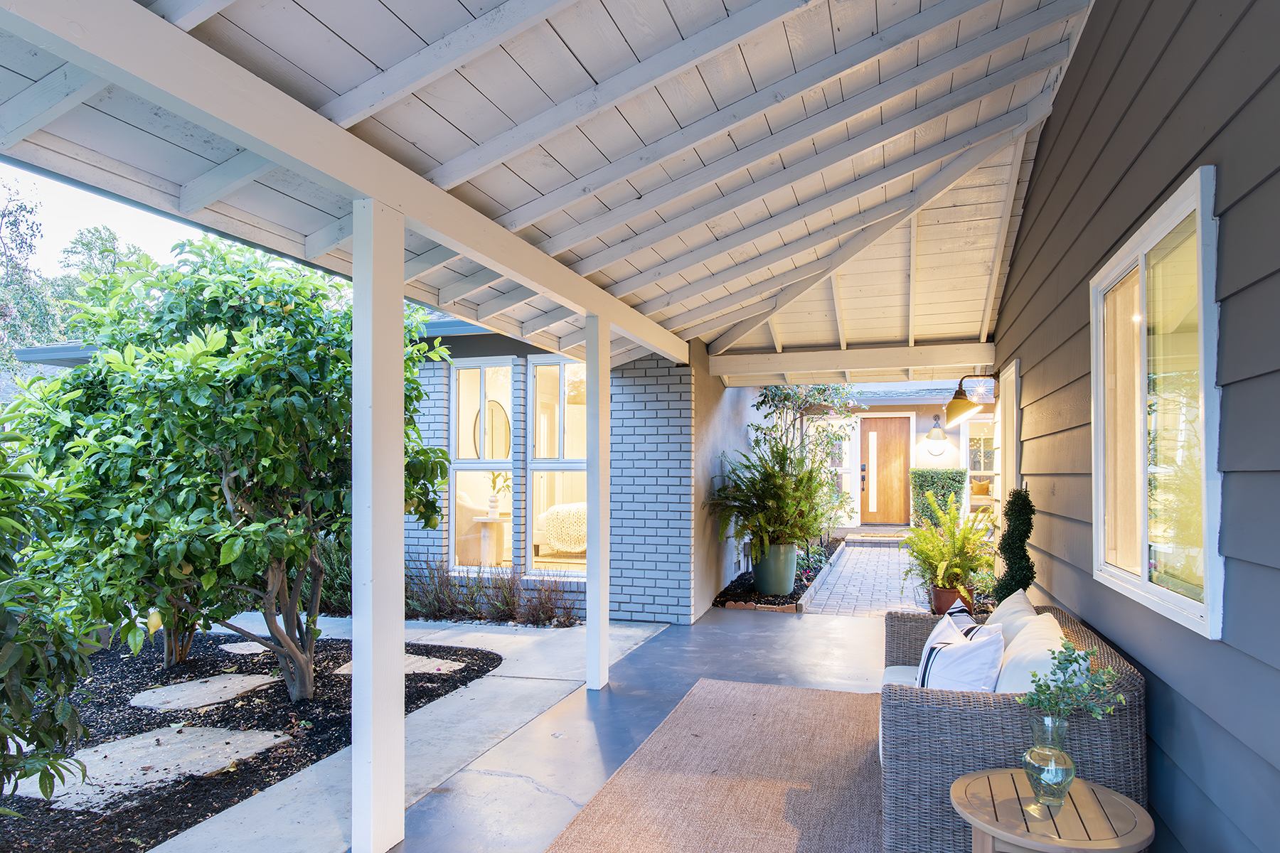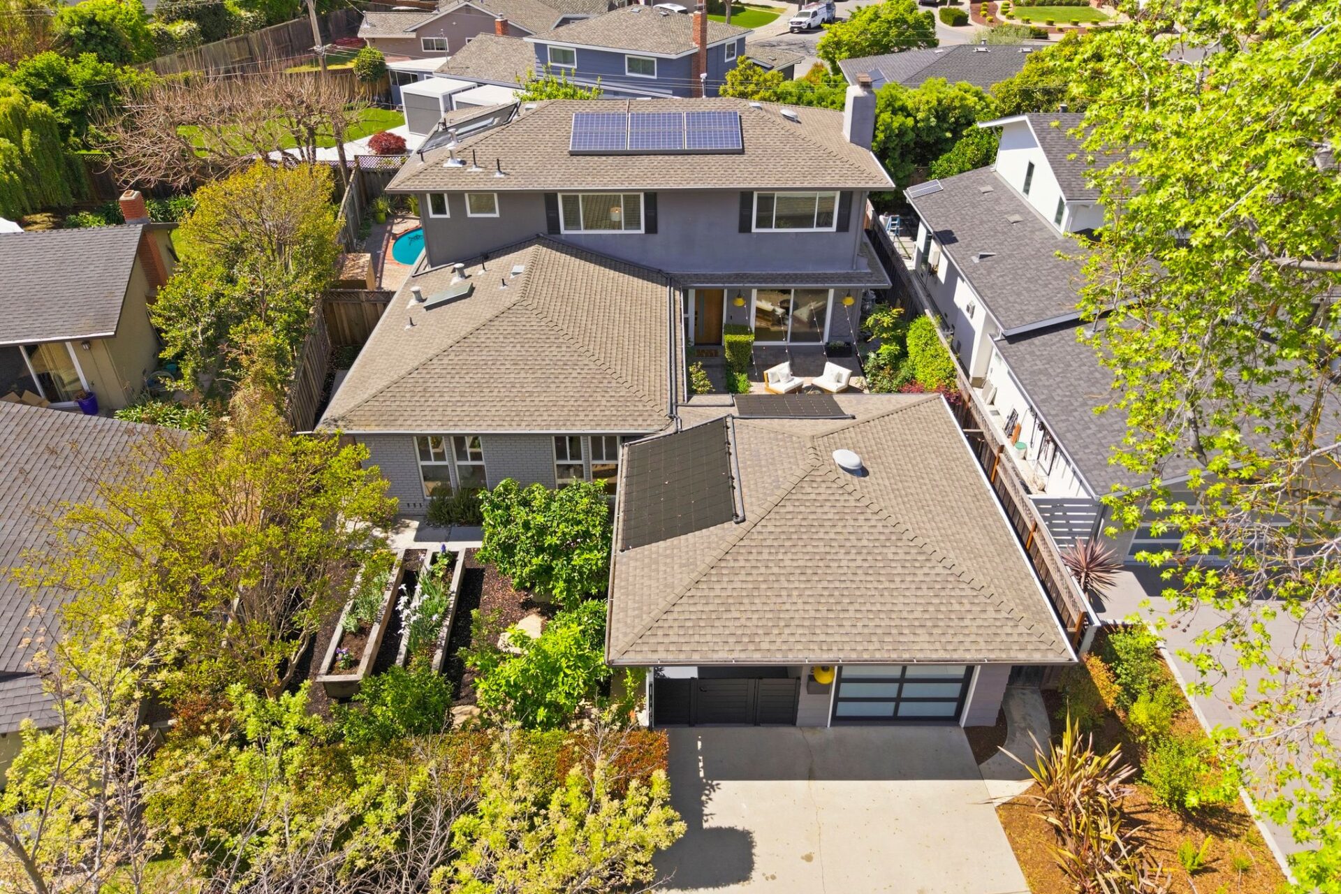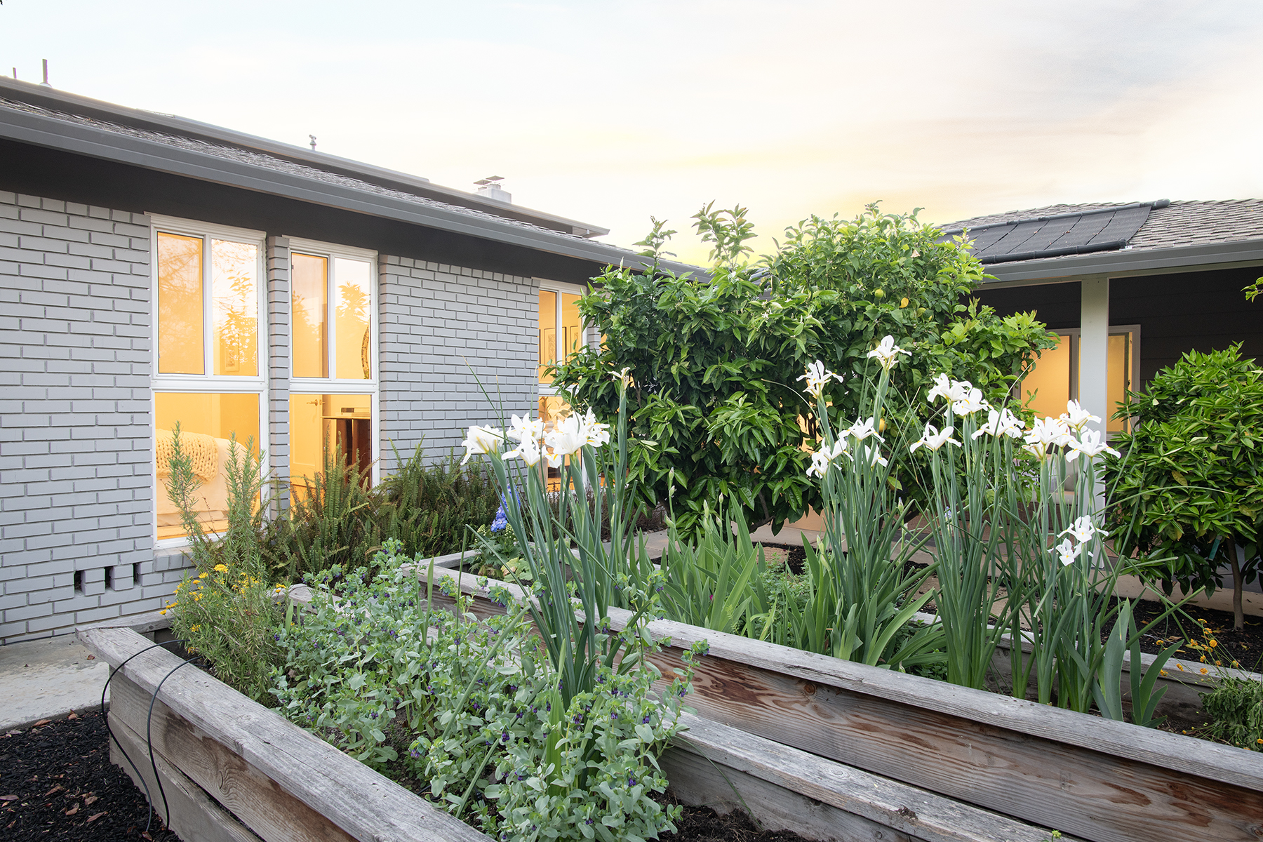 Secluded outdoor spaces offer a private leisure courtyard, freeform pool with paver terrace, and hedged edible garden with mature fruit trees.
